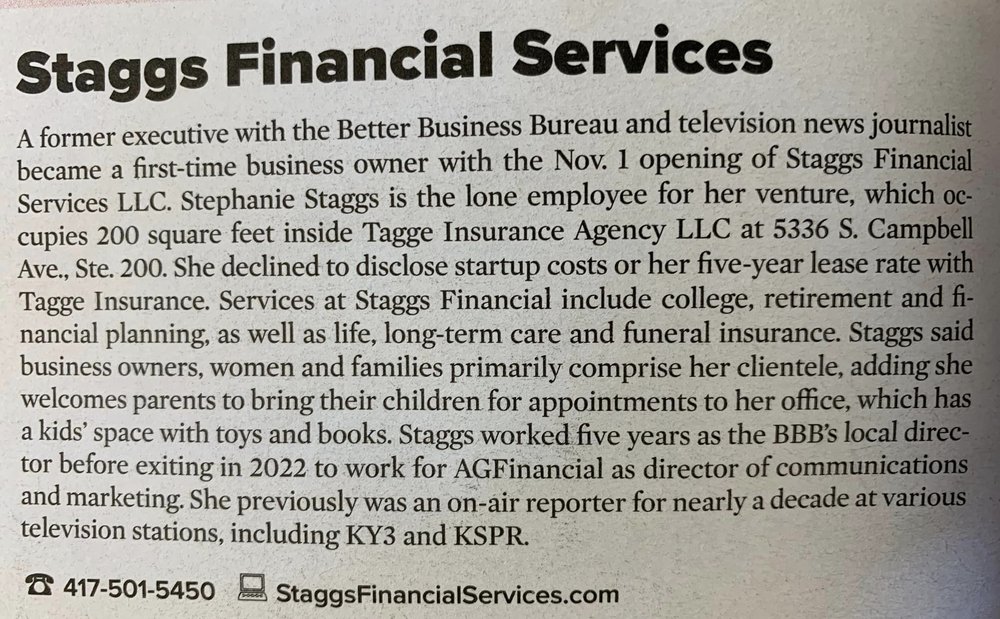 Registered Representative and Financial Advisor of Park Avenue Securities LLC (PAS). OSJ: 197 SCOTT SWAMP RD., FARMINGTON CT, 06032, 860-6772600. Securities products and advisory services offered through PAS, member FINRA, SIPC. Financial Representative of The Guardian Life Insurance Company of America® (Guardian), New York, NY. PAS is a wholly owned subsidiary of Guardian. STAGGS FINANCIAL SERVICES is not an affiliate or subsidiary of PAS or Guardian. AR Insurance License Number - 20602970.